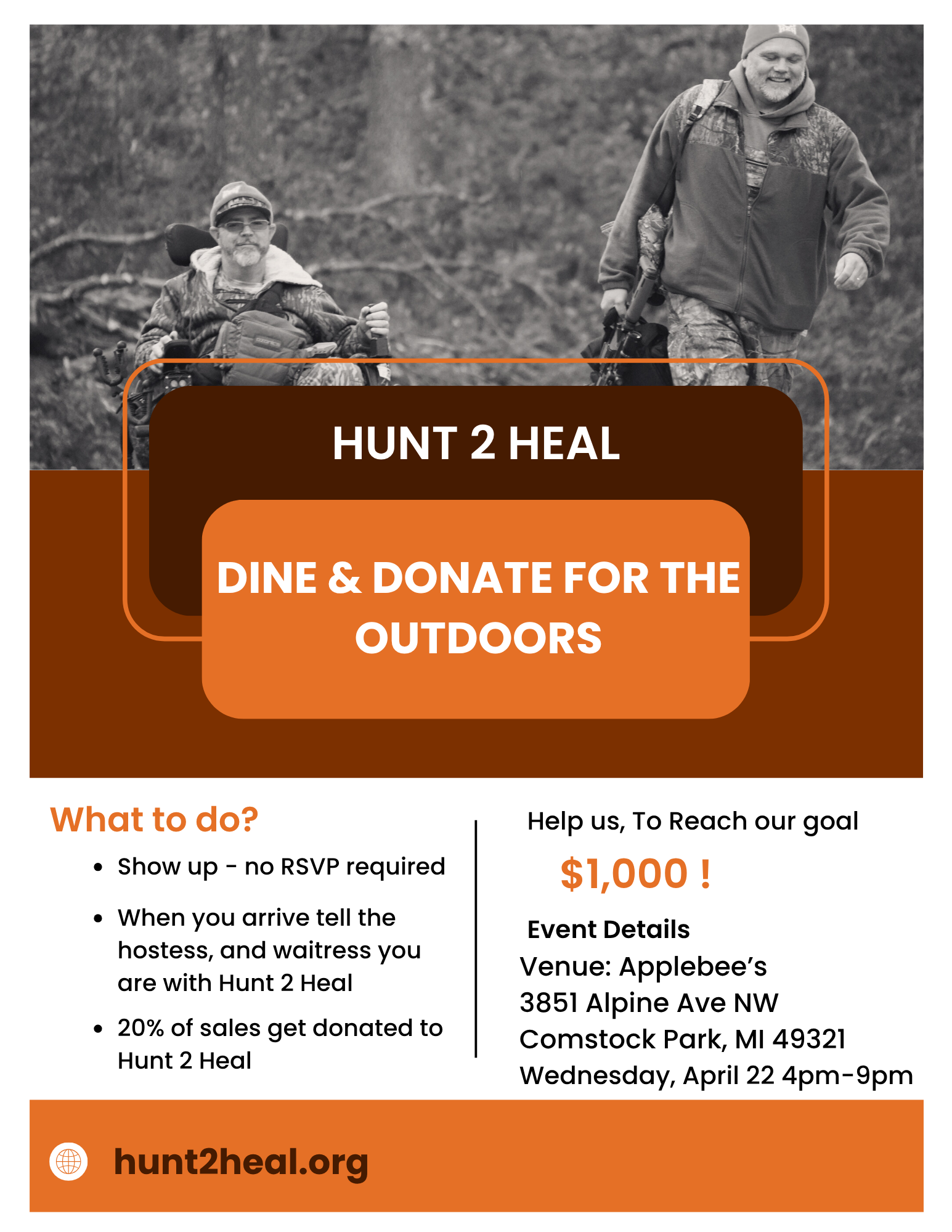 Applebee’s will donate 20% of all sales during this time back to Hunt 2 Heal to support our mission of providing accessible outdoor recreation for individuals with physical disabilities.